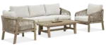 Súprava dreveného nábytku Maridgold Coffee je exkluzívna kolekcia pre voľný čas, ktorá určite osloví milovníkov boho štýlu. Pozostáva z dvoch pohodlných kresiel, efektnej sedačky pre tri osoby a dreveného konferenčného stolíka s dĺžkou 127,5 cm. Celý je vyrobený z prírodného, svetlého akáciového dreva, ktoré obohacuje priestor o exotickú atmosféru. Výrazný dizajn nábytku zvýrazňujú nylonové šnúry, ktoré sú spletené s operadlami pohovky a kresiel. Kompletnosť súpravy dopĺňajú hrubé mäkké vankúše z ľanovej látky v svetlobéžovom odtieni. Mimoriadna životnosť a odolnosť nábytku voči poveternostným vplyvom a UV žiarenie sú ich ďalšími výhodami. Ľahko ich udržíte v čistote a keďže sa poťahy vankúšov dajú ľahko sňať, môžete ich pravidelne prať v práčke. Súprava dokonale zapadne do prírodného dekoru terasy, záhrady alebo zimnej záhrady. Je to vynikajúca ponuka pre ľudí, ktorí oceňujú vonkajší relax a chcú mať vo svojej záhrade jedinečnú súpravu nábytku.