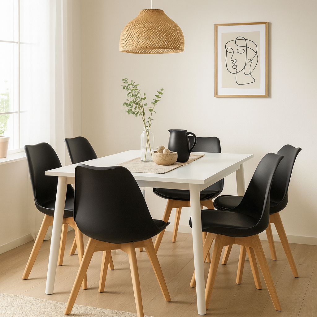Vneste do vašej kuchyne alebo jedálne nadčasový škandinávsky dizajn so setom 2 jedálenských stoličiek Škandinávia v elegantnej čiernej farbe. Tento set 2 stoličiek spája minimalistický vzhľad s vysokou funkčnosťou a komfortom, takže sa stane ideálnym doplnkom moderného interiéru.