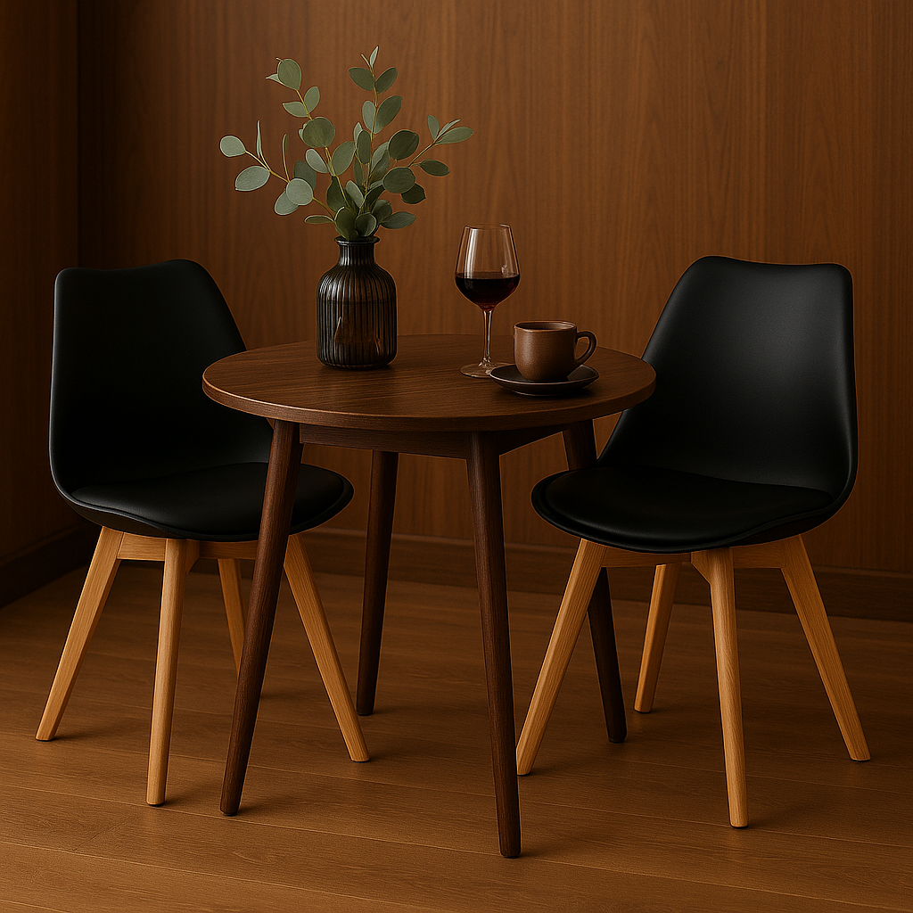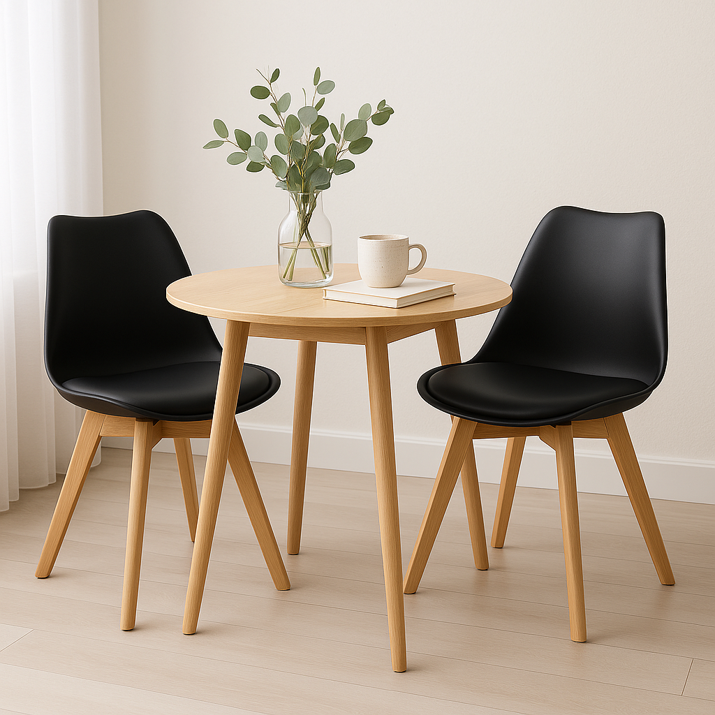 Čierna farba pôsobí elegantne a univerzálne, ľahko sa kombinuje s rôznymi štýlmi interiéru – od minimalistického po útulný domov. Tento set 2 ks je ideálny pre menšie priestory, ale skvelo doplní aj väčšie jedálne.