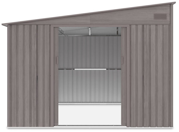 Plechový domček JASPER je priestranný, funkčný a určite ho ocenia ostrieľaní záhradkári a tí, ktorí využívajú celý arzenál zariadení na starostlivosť o zeleň. Je vyrobený z pevných materiálov, upravený v módnej, oku lahodiacej farbe a jeho konštrukciu je možné mierne upraviť podľa vašich potrieb. Tento štýlový záhradný domček má výraznú farbu svetlého dreva . Preto ju nemusíte skrývať v najvzdialenejšom kúte záhrady – táto úžitková budova nehyzdí a dokonale ladí so zelenou krajinou. Domček JASPER má veľkú rozlohu – jeho rozloha je až 8,25 m2. Preto sa vám do nej zmestí fúrik, veľká kosačka a množstvo ďalšej záhradnej techniky. Navyše sa v nej môžete voľne pohybovať, čo zvyšuje komfort používania tejto úžitkovej stavby. Domček má tiež široké posuvné dvere , takže dovnútra bez problémov vložíte aj väčšie príslušenstvo. Tento model je vyrobený z pevnej pozinkovanej ocele . Preto je trvácny a odolný voči mechanickému poškodeniu. Nehrozia jej ani poveternostné podmienky – dlhší kontakt s vlhkosťou, dážď, sneh či UV žiarenie. Táto konštrukcia je vybavená vetracími otvormi. Zabezpečujú cirkuláciu vzduchu a osvetlenie interiéru domčeka.