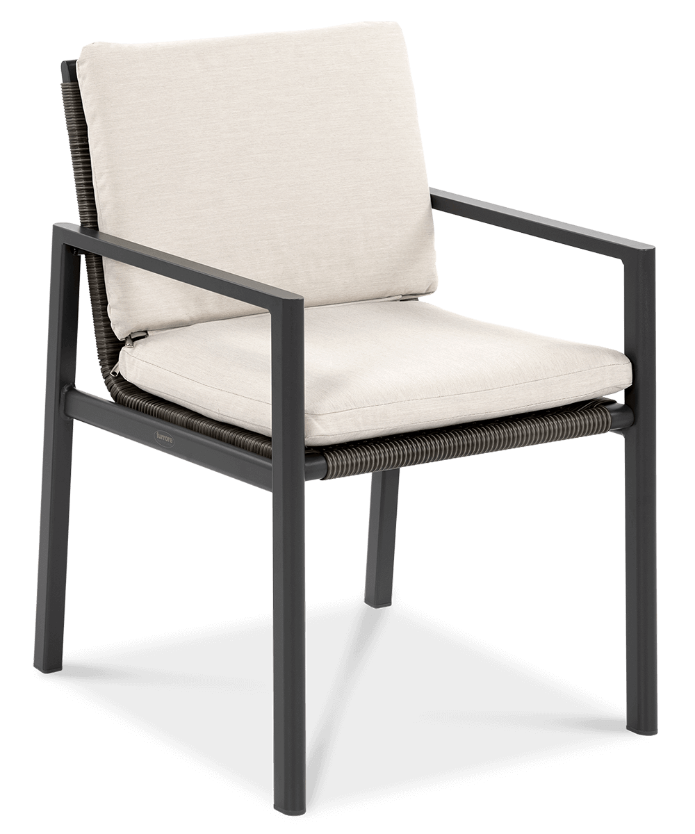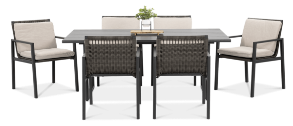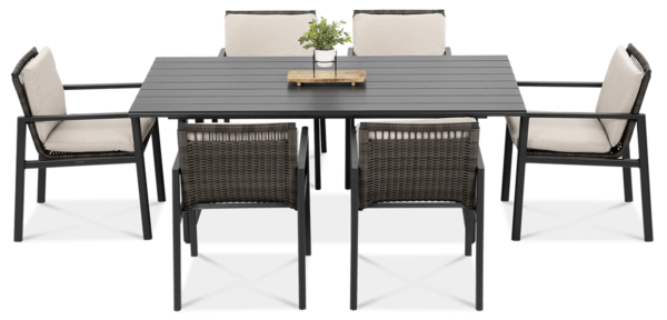 Jedálenský set LOTUS DINING 6+1 je elegantný a veľmi štýlový jedálenský set pre 6 osôb. Pozostáva z efektného stola s dĺžkou 180 cm a 6 pohodlných kresiel s mäkkými vankúšmi na sedákoch a operadlách. Súprava pôsobí veľmi moderne a veľmi pohodlne sa používa. Rafinovaný a originálny charakter nábytku zvýrazňuje jeho moderná farba, teda módna tmavošedá. Konštrukcia je vyrobená z ľahkého a veľmi odolného hliníka, ktorý bol precízne lakovaný kvalitnou farbou. Štýl celku dodáva ratan použitý na dokončenie operadiel a sedadiel kresiel. Vďaka tomu nábytok získava luxusný a jednoduchý dizajn. Zaujímavý efekt je dosiahnutý kombináciou tmavého nábytku a svetlého materiálu použitého na poťahoch vankúšov.