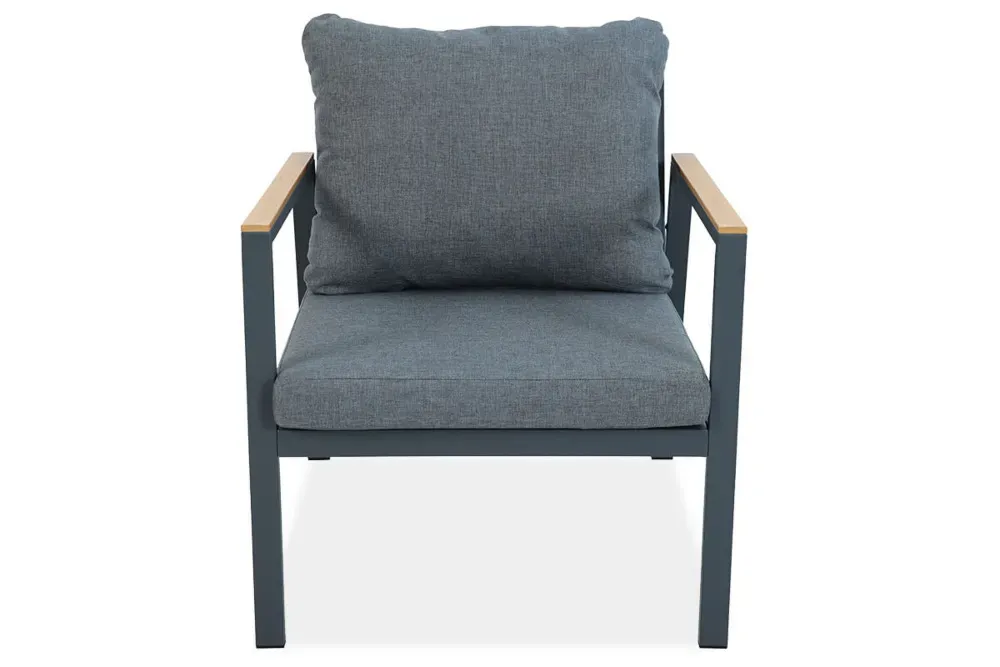 Súprava obsahuje dve kreslá, trojmiestnu pohovku a praktický stolík, pričom komfort pri sedení zabezpečujú hrubé sedáky a opierky vyrobené z odolnej olefínovej tkaniny (200 g), ktorá je rezistentná voči vlhkosti a UV žiareniu.