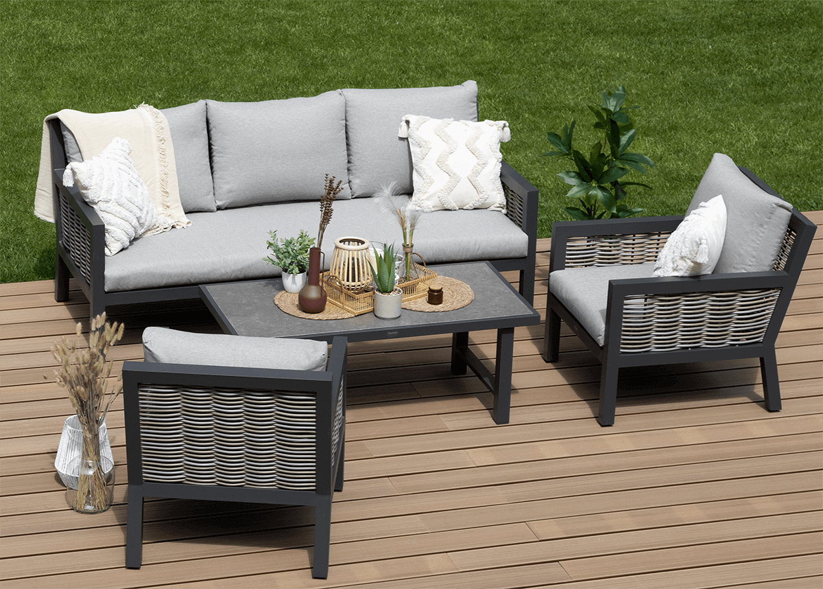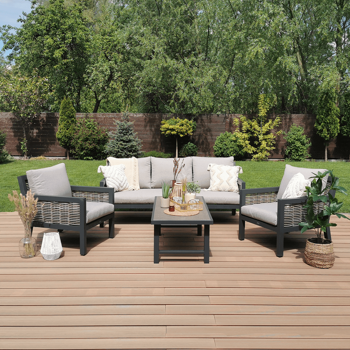 - rám zostavy je vyrobený z hliníka lakovaného sivou farbou a boky a operadlá nábytku sú zdobené prirodzene vyzerajúcim a hrubým syntetickým ratanom.