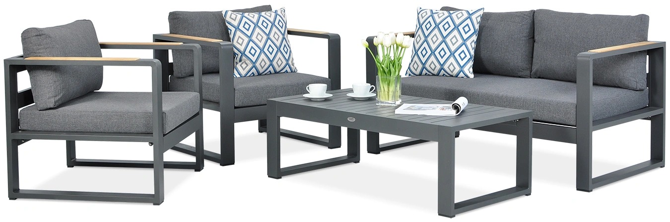 4 kusy nábytku a mnoho využití, sedacia súprava Panama obsahuje pohovku pre 2 osoby, dve predĺžené kreslá a konferenčný stolík. Všetky prvky spája fantastický dizajn, solídne spracovanie a výnimočná odolnosť. Záhradný nábytok Panama je vyrobený z hliníka – ľahkého a veľmi odolného materiálu. Setu Panama neublížia ani zrážky, pobyt na slnku, ani prudké zmeny teplôt. Odolnosť hliníkového záhradného nábytku z neho robí výbornú voľbu pre najnáročnejších užívateľov. Sedaciu súpravu Panama je možné rozložiť na záhrade pri dome, v obývačke, na terase hotela či reštaurácie. Vyzerá skvele všade a poskytuje používateľom najvyššiu úroveň pohodlia. Estetickým poznávacím znakom zostavy Panama sú určite drevené vložky na opierkach kresiel a pohoviek. Súprava záhradného nábytku obsahuje veľké mäkké vankúše na sedáky a opierky. Je o ňu jednoduchá starostlivosť. Nevyžaduje žiadnu dodatočnú údržbu, aby sa predišlo hrdzaveniu, a prípadné nečistoty sa zvyčajne dajú odstrániť čistou vodou.